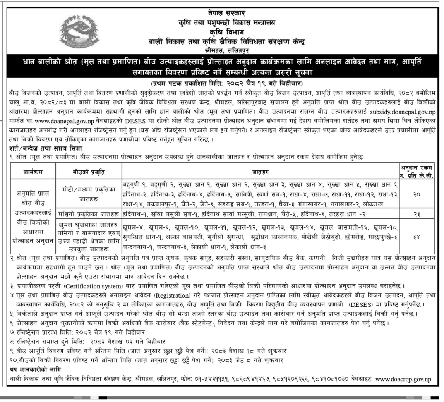 नयाँ जानकारी / सूचना Document Archieve S.N. Title View Download सूचना- धान बालीको श्रोत बीउ उत्पादकहरुलाई प्रोत्साहन अनुदान 1 सूचना View Download
